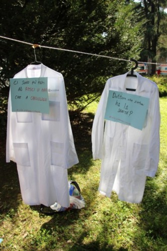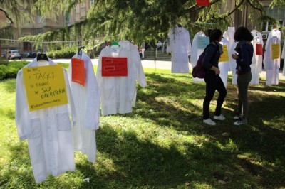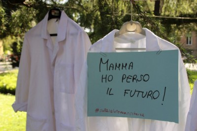 Bologna, 8 apr. – Due laureati su tre rischiano di restare senza specializzazione o saranno costretti a trasferirsi all’estero. Gli studenti di medicina sono tornati a protestare contro il taglio alle borse di studio per i contratti di formazione specialistica: attualmente ci sono 3.300 posti da specializzando a fronte di 10mila studenti che cercano ogni anno ad entrare nelle scuole di specializzazione. Camici bianchi, appesi come cartelli davanti al paglione 11 del policlinico Sant’Orsola, recitano: “Medico fantasma”, “Investire sui medici si chiama prevenzione”, “#sullasalutenonsischerza”.
