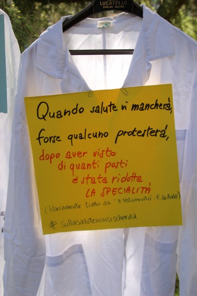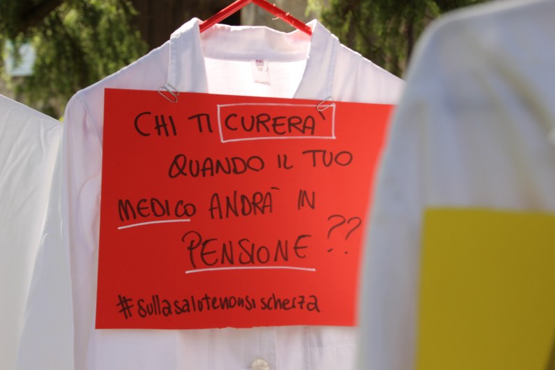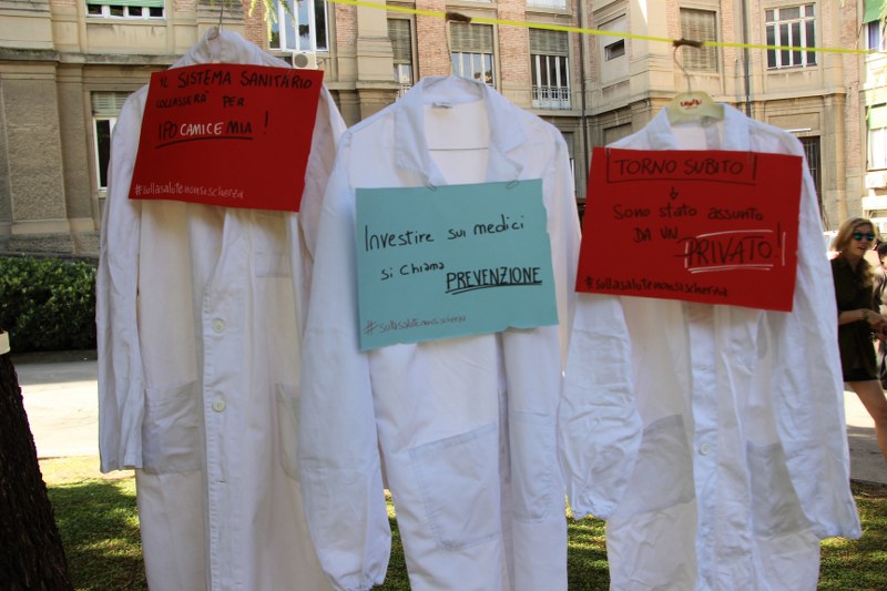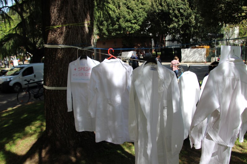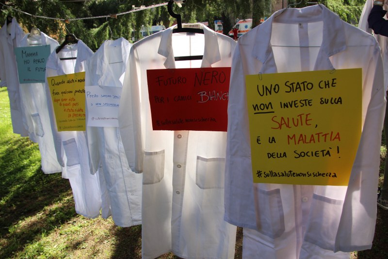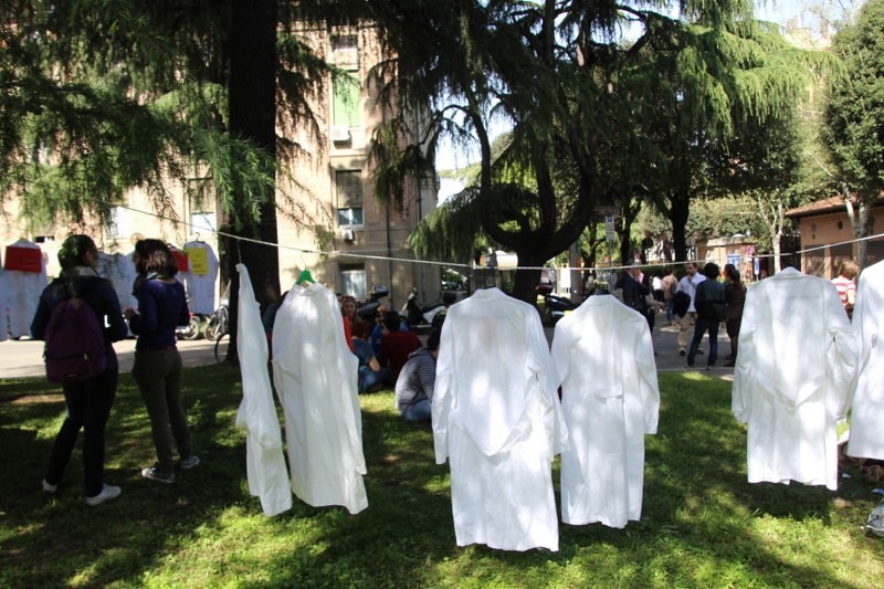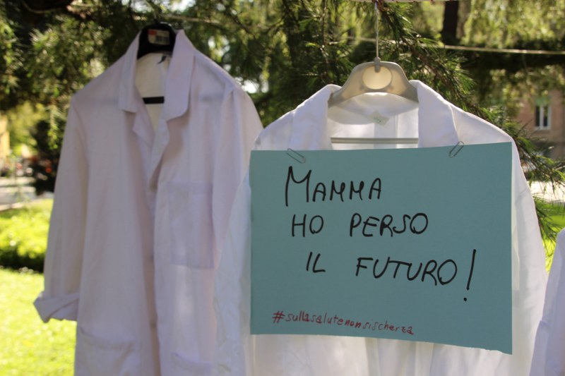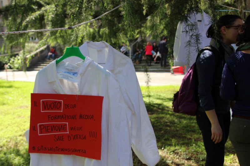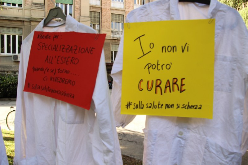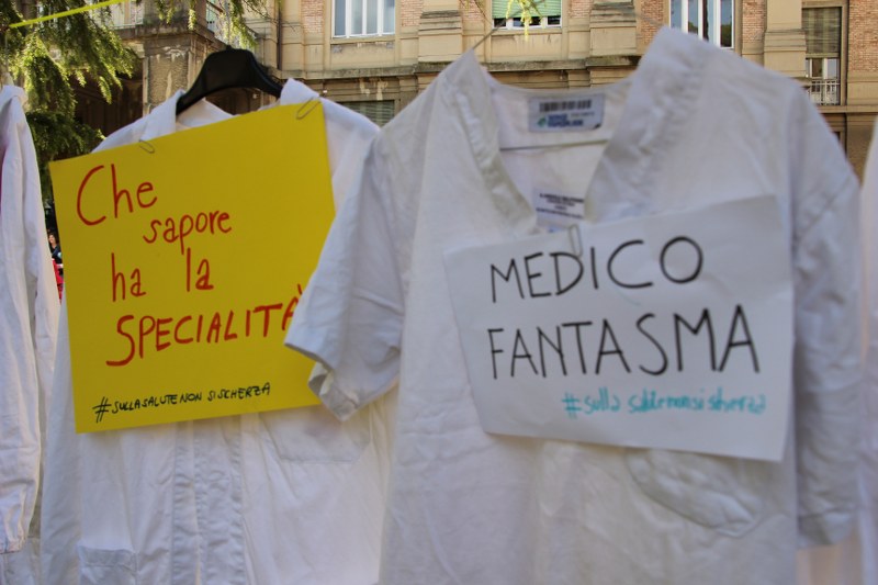 Bologna, 8 apr. – Due laureati su tre rischiano di restare senza specializzazione o saranno costretti a trasferirsi all’estero. Gli studenti di medicina sono tornati a protestare contro il taglio alle borse di studio per i contratti di formazione specialistica: attualmente ci sono 3.300 posti da specializzando a fronte di 10mila studenti che cercano ogni anno ad entrare nelle scuole di specializzazione. Camici bianchi, appesi come cartelli davanti al paglione 11 del policlinico Sant’Orsola, recitano: “Medico fantasma”, “Investire sui medici si chiama prevenzione”, “#sullasalutenonsischerza”.
