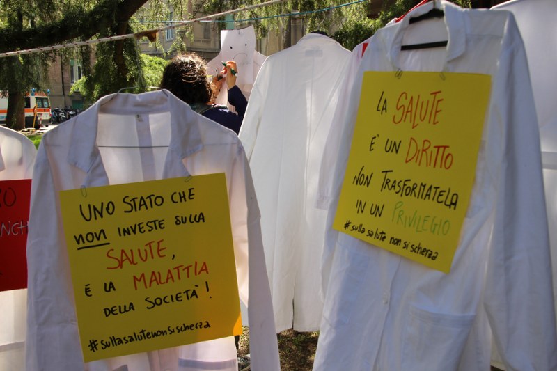 “In un colpo solo colpiscono istruzione e sanità” denunciano gli studenti del gruppo Prometeo che spiegano: “Se gli studenti non si possono specializzare ci sarà in futuro una forte carenza di medici, perché la laurea non basta”. Con loro anche gli studenti di Link-Coordinamento Universitario di Bologna.