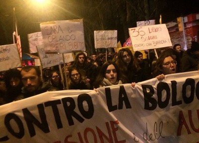 Bologna, 11 feb. – Contro l’intervento della polizia in università, contro il rettore che “ha chiamato la celere”, contro il questore che ne ha disposto l’intervento, contro il sindaco che li ha attaccati definendo le loro proteste “violente e velleitarie”. Gli universitari guidati dal Cua, il collettivo universitario autonomo, hanno sfilato per le vie del centro storico, bloccato il traffico sui viali e urlato a squarciagola che l’università “deve restare libera”, e che invece Bologna “è sprofondata nel vortice dell’austerità e della repressione”. Un corteo che arriva dopo lo sgombero di giovedì della biblioteca universitaria di via Zamboni, i successivi scontri e la manifestazione di venerdì finita con una carica e due arresti (in attesa del processo il 9 marzo sono stati disposti i domiciliari).