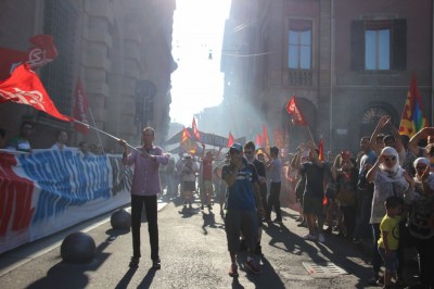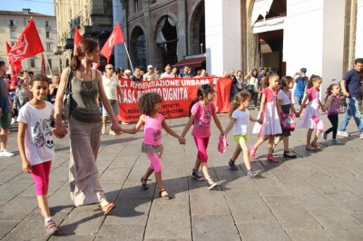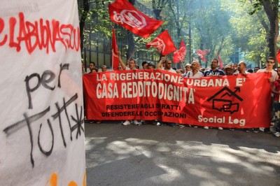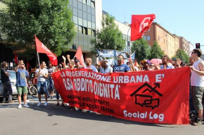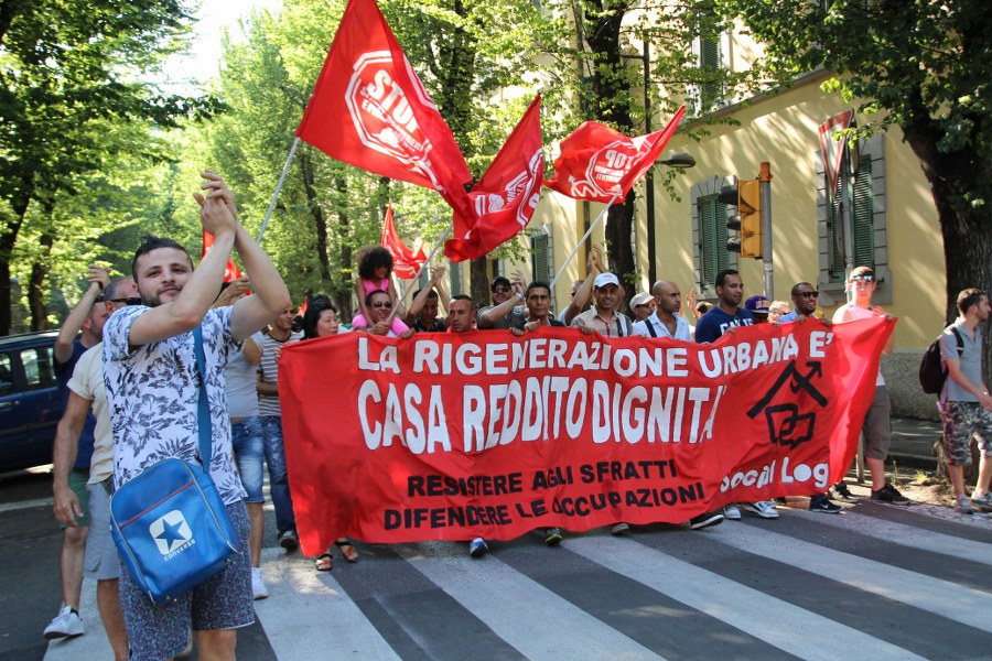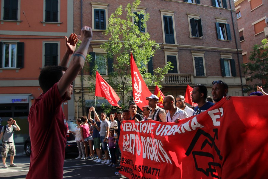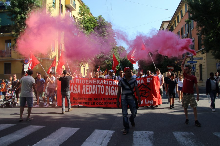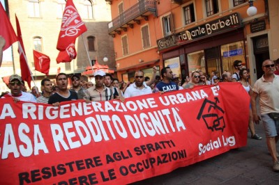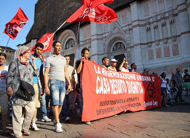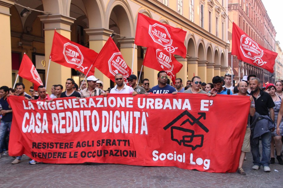 Bologna, 6 giu. – “Con la pensione minima non riesco a pagare l’affitto, il cibo e le bollette”. E’ Costantino, di ottant’anni, a raccontare cosa significa essere sotto sfratto, alla fine della “marcia” organizzata dal collettivo Social Log. E’ nato a Rovigo, abita a Bologna da sessant’anni e si commuove quando si parla di lui, della solidarietà portata sotto casa sua in Bolognina all’arrivo dell’ufficiale giudiziario. Lo abbraccia un giovane occupante di origine marocchina ed è solo una delle tante immagini della “Bologna meticcia”, come la chiamano negli slogan, che si sono viste nel corteo che dall’occupazione dell’ex Telecom è arrivato fino alla Prefettura di Bologna. Se all’inizio erano soprattutto gli stranieri in difficoltà ad accedere agli sportelli del collettivo, ci racconta Luca Simoni, ora sono sempre di più anche gli italiani. Quando abbiamo chiesto a Costantino come ha conosciuto Social Log è stata la moglie a rispondere, semplicemente: “Sono i nostri vicini di casa”.