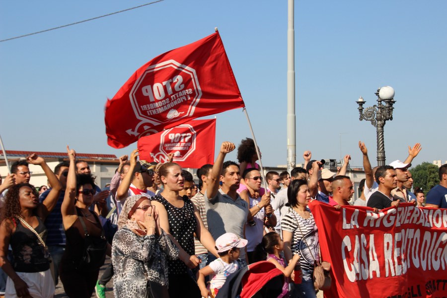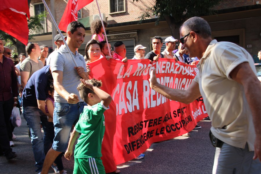 Mille persone in corteo, moltissimi bambini che si sgolavano ad urlare “casa, reddito, dignità”. Alcuni di loro abitano in occupazione, altri sono sotto sfratto e si svegliano all’alba per uno o due giorni a settimana per andare in presidio di fronte alla casa di turno in cui si presenterà l’ufficiale giudiziario. Sanno che quando toccherà a loro non saranno da soli. Così come successo anche in via Mario de Maria e in via Fioravanti all’ex Telecom, quando si sono presentati gli agenti della Digos per notificare il sequestro deciso dal tribunale del Riesame.