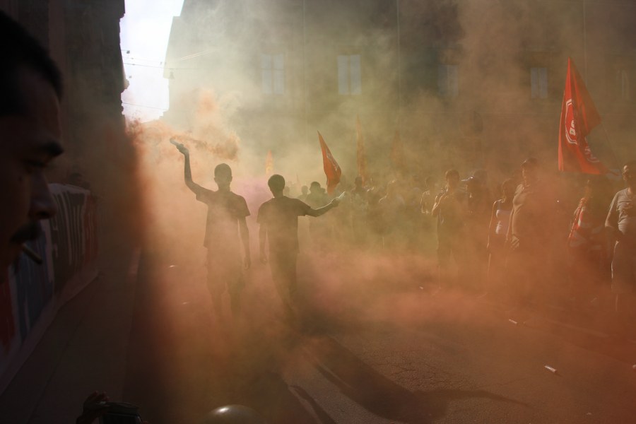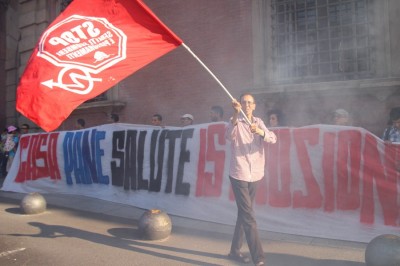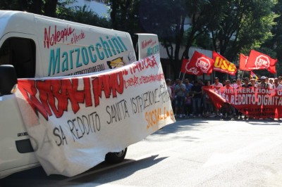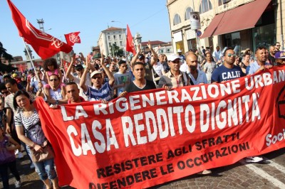 Davanti alla Prefettura è stato srotolato uno striscione lungo venti metri con una lista di bisogni: “Casa, pane, salute, istruzione, infanzia felice, reddito, dignità”.