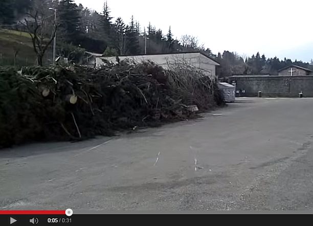 Un fermo immagine del video di Vivere Monzuno che mostra gli alberi stesi nel piazzale del cimitero