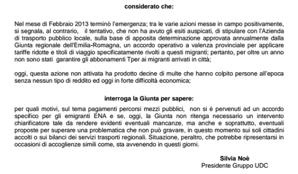 Intanto il problema di Miled, Lamine, e di tutti i profughi che hanno accumulato multe sui bus, arriva nei palazzi della Regione. La consigliera dell’Udc Silvia Noè ha presentato un’interrogazione scritta (qui la versione pdf) in cui chiede alla giunta “per quali motivi, sul tema pagamenti percorsi mezzi pubblici, non si è pervenuti ad un accordo specifico per gli emigranti Ena (emergenza nord Africa, ndr) e se la Giunta non stia preparando provvedimenti per risolvere un problema che potrebbe ripresentarsi a brevissimo con l’arrivo di nuovi profughi, “come sta avvenendo in questi giorni”. Noè ricorda come tra il 2011 e il 2012 furono accolti in tutta l’Emilia-Romagna 1500 profughi.