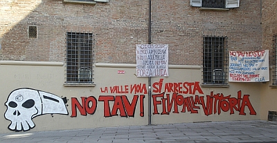 8 mar. – Dopo la parade che ha attraversato le vie della zona universitaria nella serata di mercoledì 7 marzo organizzata dal laboratorio Crash e dal collettivo Cua un grande murales No tav è apparso in piazza Verdi.