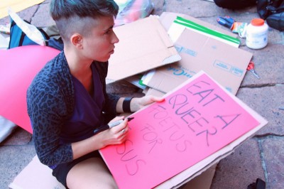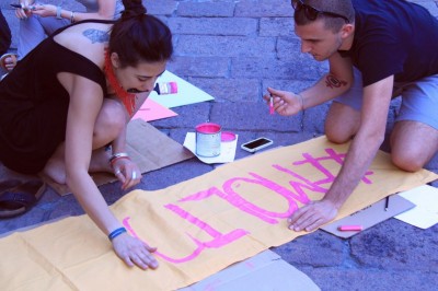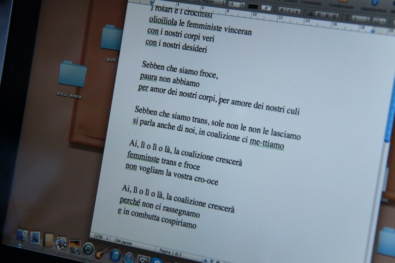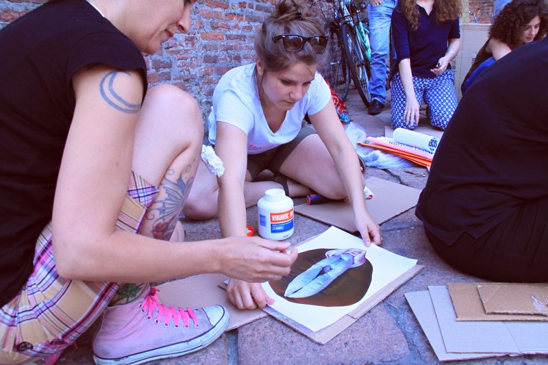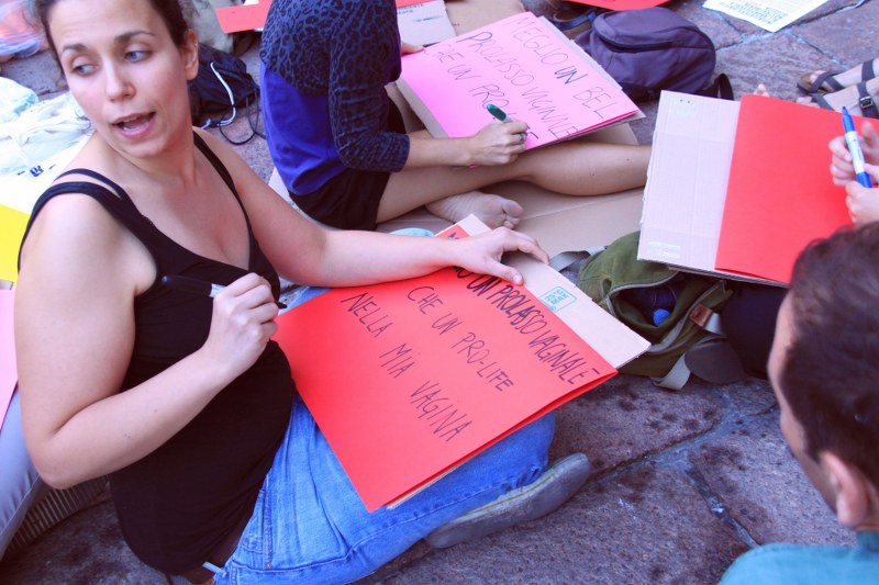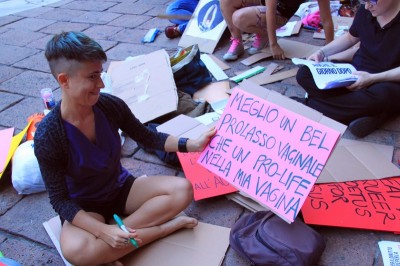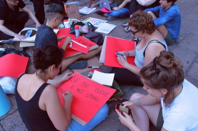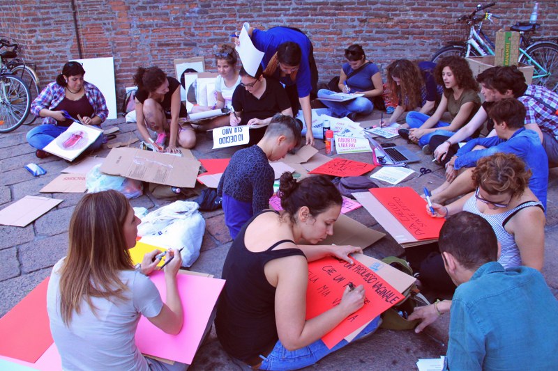 Proprio per prepararsi al 13 giugno, le attiviste della Favolosa Coalizione si sono date appuntamento ieri in Piazza del Nettuno per un laboratorio a cielo aperto. “Laboratorio di Squirt Attack” lo hanno chiamato e hanno invitato tutte e tutti a unirsi a loro portando “colori-cartoni-forbici-colla-stoffe fuxia-tanta voce per la Corale e immaginazione a mille contro la tristezza dei no194!”. Così le scalinate di Sala Borsa si son riempite di colorati cartelloni con scritte. La Coalizione scenderà in piazza anche per “la libertà delle scelte riproduttive, sessuali, affettive di tutte e tutti”.