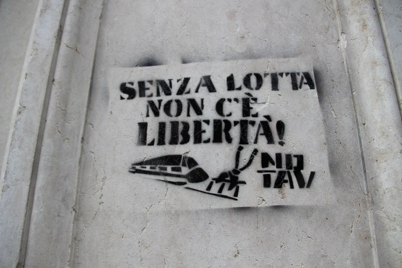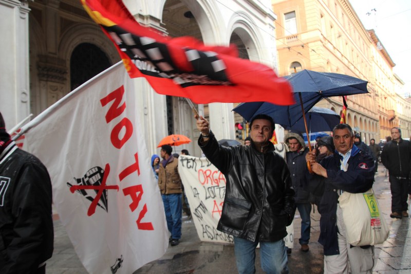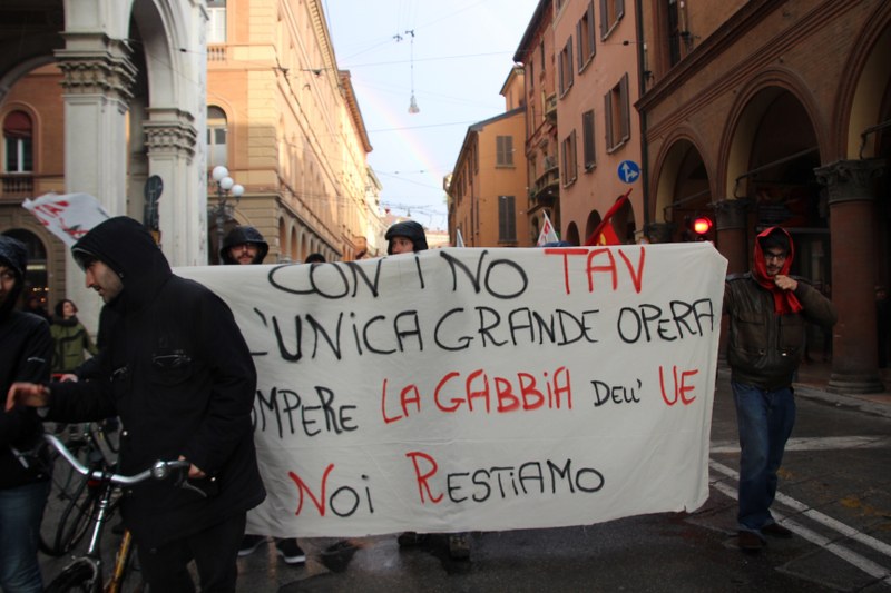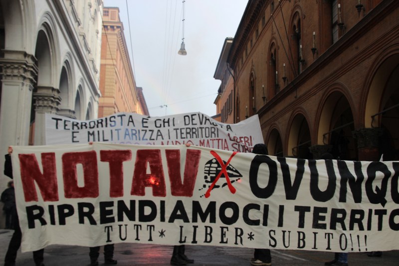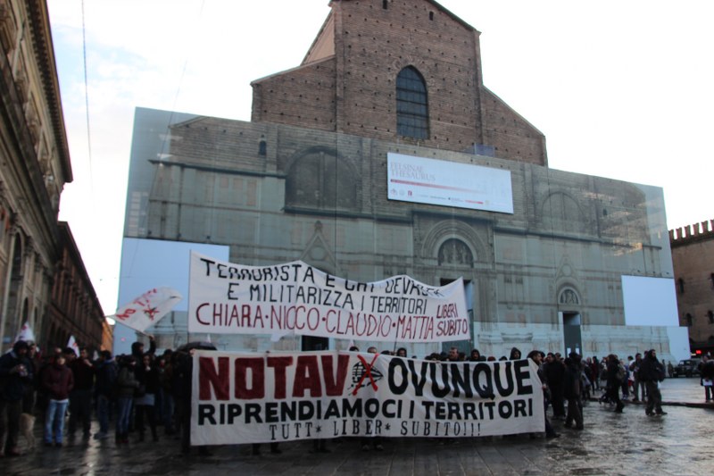 Il corteo bolognese in segno di solidarietà ai quattro arrestati No Tav accusati di “attentato con finalità terroristiche, atto di terrorismo con ordigni micidiali ed esplosivi, oltre che detenzione di armi da guerra e danneggiamenti”. Lo striscione di apertura recitava: “Terrorista è chi devasta e militarizza i territori”. Dalle Due Torri il corteo è passato in via Farini, in piazza Maggiore e via In dipendenza. Il processo dei quattro si celebrerà in Corte d’Assise, e la prima udienza è fissata il 14 maggio. I quattro sono stati trasferiti dal carcere delle Vallette in altre strutture penitenziarie di alta sicurezza (a Ferrara, ad Alessandria e a Rebibbia).