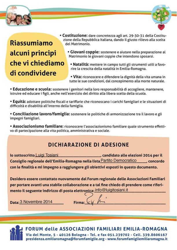 Intanto arriva lo stop del circolo Arcigay “il Cassero” nei confronti di Luigi Tosiani (Pd), che ha firmato il manifesto del Forum delle associazioni famigliari a favore della famiglia tradizionale. A puntare il dito contro il candidato bolognese è il presidente del Cassero, Vincenzo Branà. “Vi segnalo che Tosiani ha firmato il manifesto delle Sentinelle (cambiano nome ogni volta, ma sono sempre clericofascisti). Quindi non bisogna votare Tosiani alle prossime regionali”, ha scritto questa mattina Branà su Facebook. “Da evitare anche tutte le candidate che si propongono in tandem con lui. Quindi attenzione…”. Ieri il dibattito sul riconoscimento delle unioni omosessuali è tornato a sollevarsi per la decisione del prefetto di Bologna di invalidare il registro dei matrimoni gay contratti all’estero.