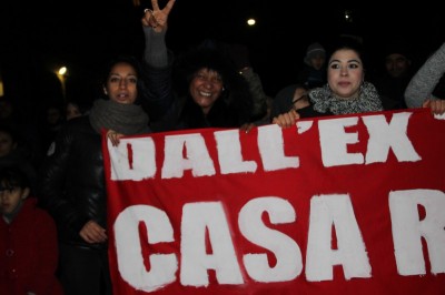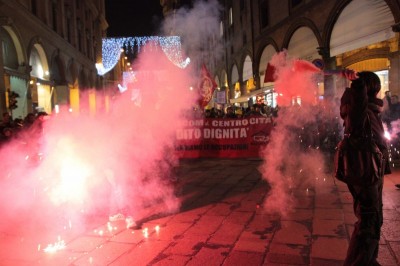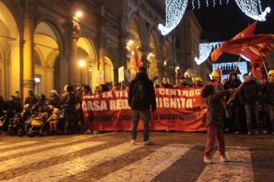 Quando il corteo arriva a metà di in via Indipendenza un’orchestra di strada inizia a suonare e per alcuni minuti il corteo diventa una festa. Poi l’arrivo in via Rizzoli e gli interventi di attivisti e occupanti si susseguono al microfono. Le storie si ripetono simili, storie di solitudine, di povertà improvvisa a causa di un licenziamento, la perdita della casa poi la decisione di occupare. “Grazie all’occupazione facciamo il Natale insieme e con un tetto sulla testa” dicono in conclusione del corteo, invitando i passanti delle ultime ore dello shopping delle feste a venire a conoscerli.