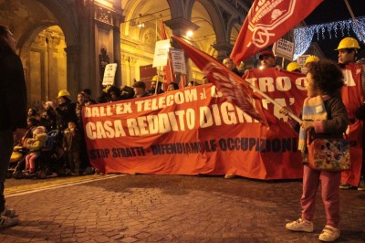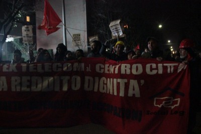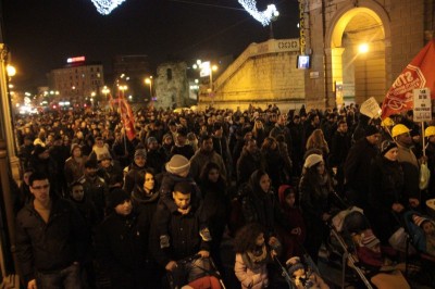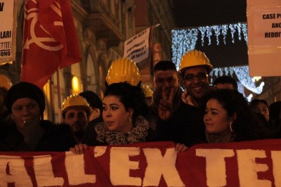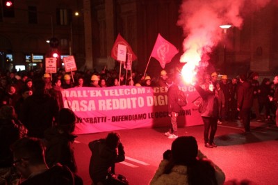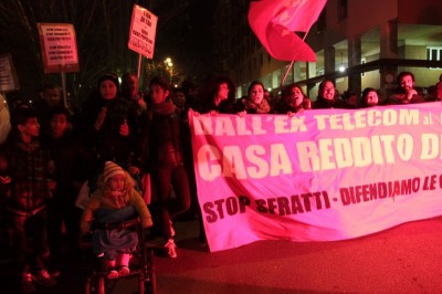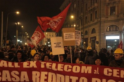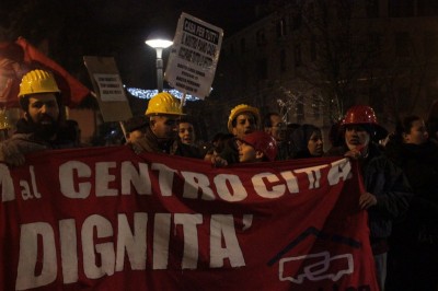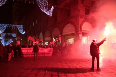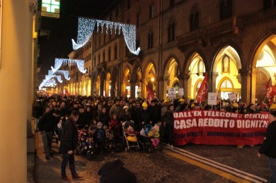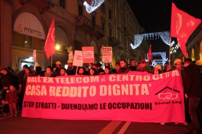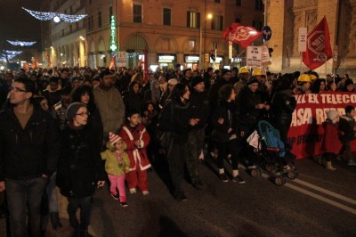 Bologna, 20 dic. – A due settimane dall’ingresso nello stabile dell’ex Telecom gli occupanti di Social Log sono scesi in corteo fino in centro, sotto l’albero di Natale di piazza Nettuno. Con loro anche gli occupanti di via Mario de Maria e di Mura Porta Galliera, studenti e attivisti del Laboratorio Crash, oltre a una sparuta rappresentanza di altre sigle di movimento. Quasi mille persone sono partite da via Fioravanti. Mentre di fronte all’occupazione si distribuiva il tè alla mente per scaldarsi sono partiti i fuochi d’artificio dal tetto dell’occupazione. Il segnale per partire in corteo ma anche un saluto alla Bolognina. “Questo quartiere, prima in via Mario de Maria poi in via Fioravanti, ci ha dato solidarietà, regalato giochi per i bambini e materassi” spiegano dal megafono. Un occupante di Mario de Maria racconta anche che, quando è stata staccata l’acqua al condominio occupato, alcuni vicini di casa hanno aperto loro le porte (e i bagni) perché gli occupanti potessero fare la doccia.