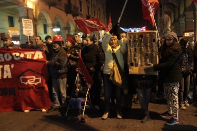 Più volte negli interventi si ripetono le richieste del corteo e delle occupazioni: moratoria degli sfratti e degli sgomberi delle occupazioni abitative, riconoscimento dell’autorecupero degli stabili vuoti e in stato di degrado, come una delle soluzioni per l’emergenza abitativa. Tra i passanti si vede qualche faccia stupita, incuriosita e anche qualcuno che dalle finestre saluta e mostra una bandiera No Tav. Sono molti i cartelli che chiedono che vengano cancellate le grandi opere per dare priorità al diritto alla casa.