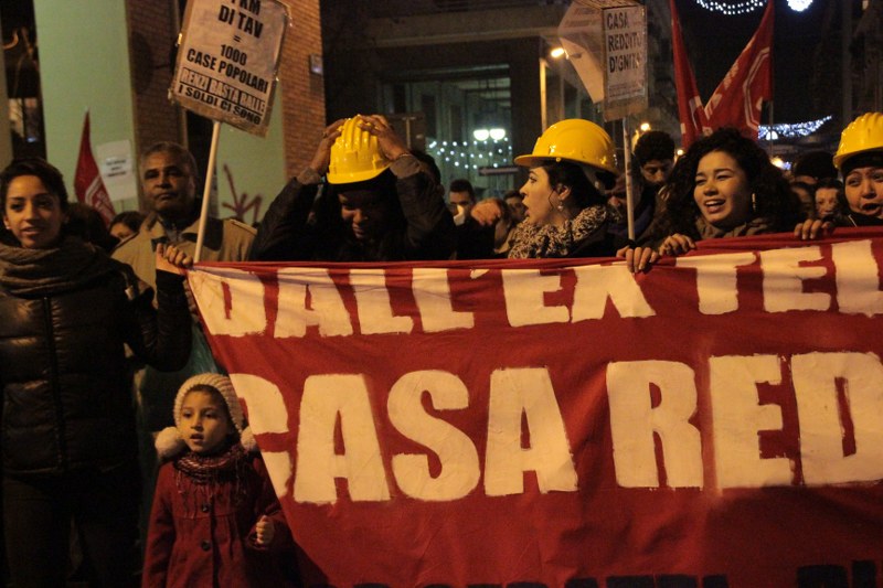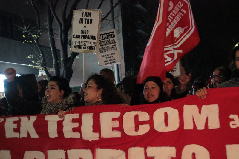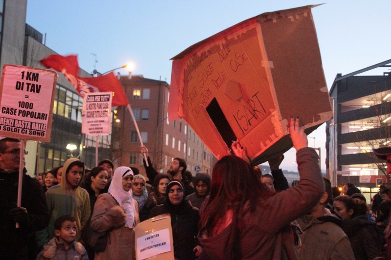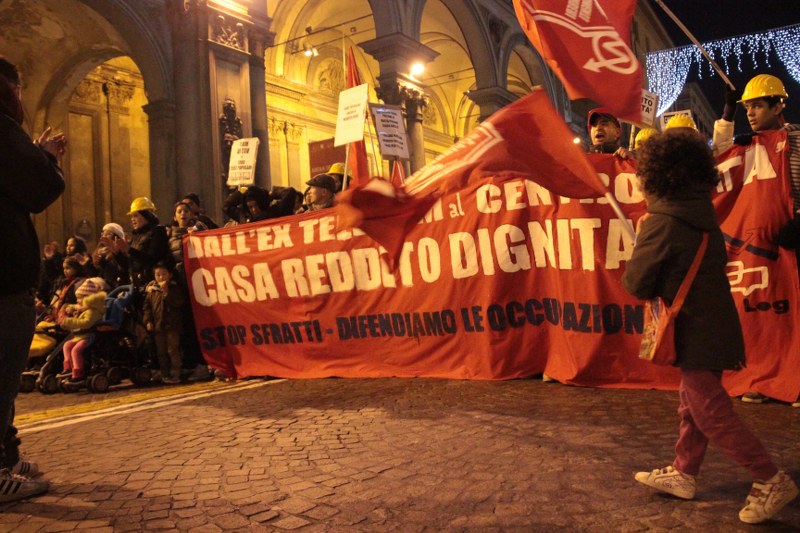 Più volte negli interventi si ripetono le richieste del corteo e delle occupazioni: moratoria degli sfratti e degli sgomberi delle occupazioni abitative, riconoscimento dell’autorecupero degli stabili vuoti e in stato di degrado, come una delle soluzioni per l’emergenza abitativa. Tra i passanti si vede qualche faccia stupita, incuriosita e anche qualcuno che dalle finestre saluta e mostra una bandiera No Tav. Sono molti i cartelli che chiedono che vengano cancellate le grandi opere per dare priorità al diritto alla casa.
