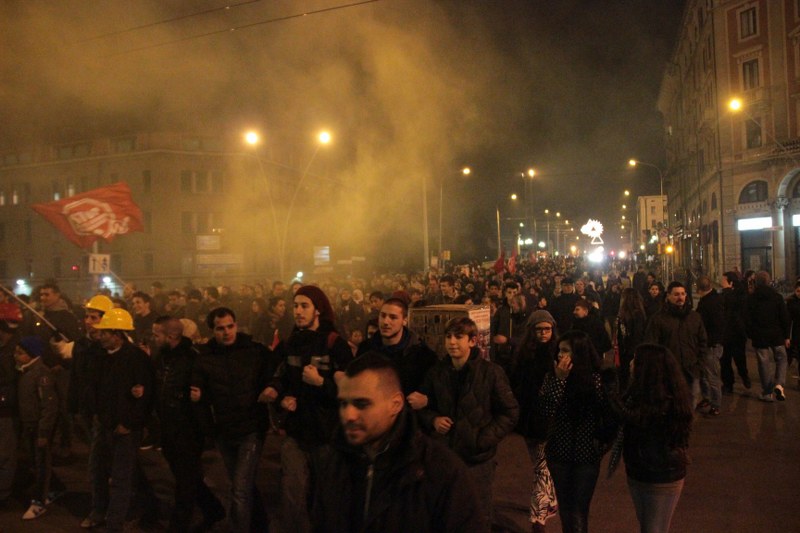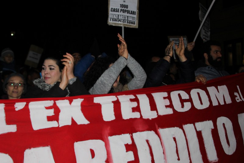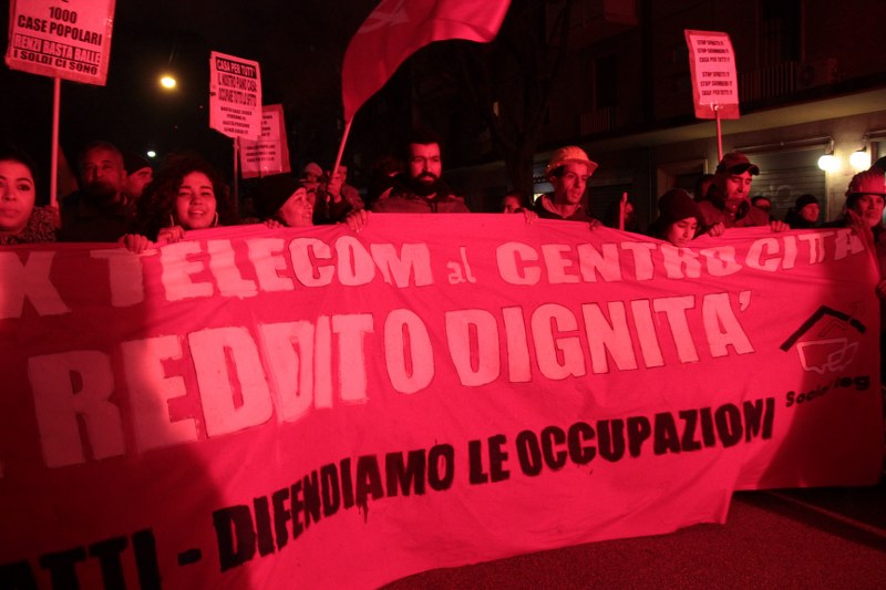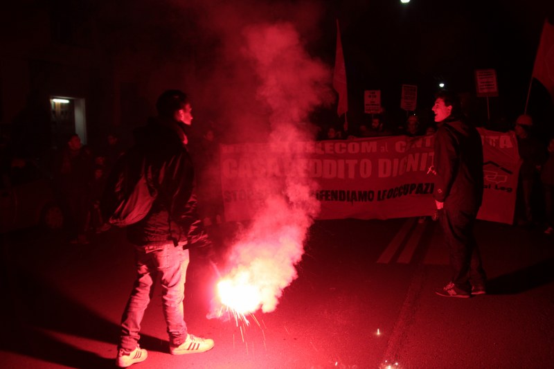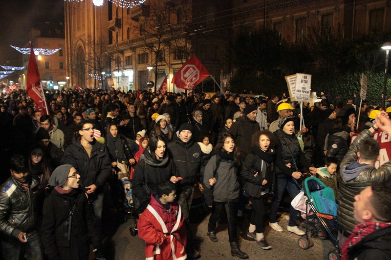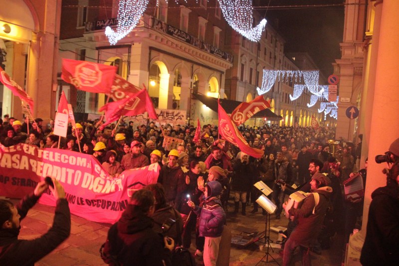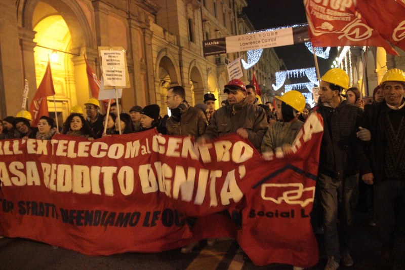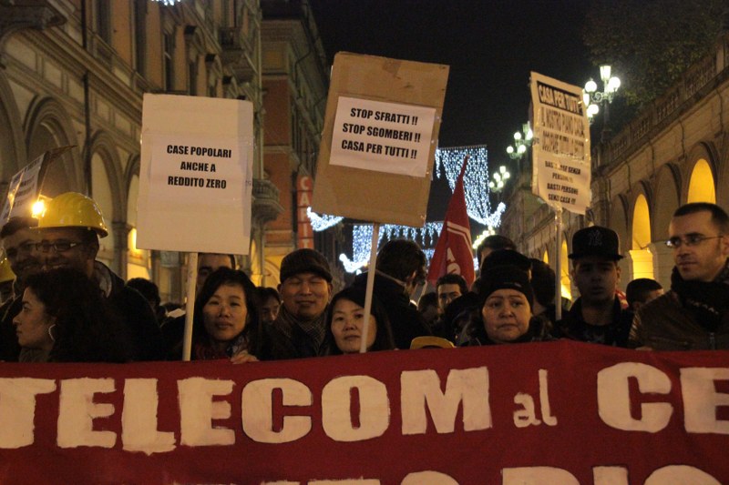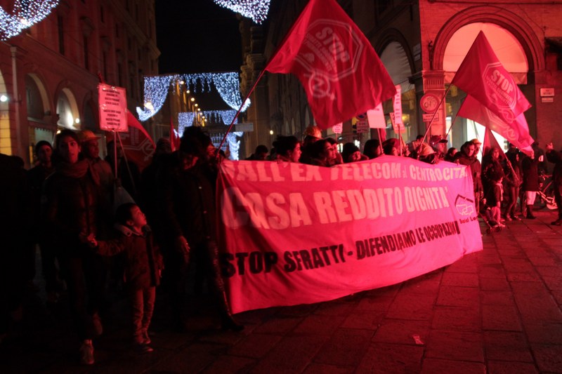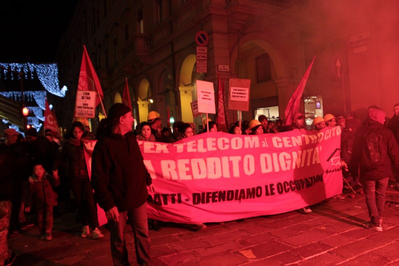 Bologna, 20 dic. – A due settimane dall’ingresso nello stabile dell’ex Telecom gli occupanti di Social Log sono scesi in corteo fino in centro, sotto l’albero di Natale di piazza Nettuno. Con loro anche gli occupanti di via Mario de Maria e di Mura Porta Galliera, studenti e attivisti del Laboratorio Crash, oltre a una sparuta rappresentanza di altre sigle di movimento. Quasi mille persone sono partite da via Fioravanti. Mentre di fronte all’occupazione si distribuiva il tè alla mente per scaldarsi sono partiti i fuochi d’artificio dal tetto dell’occupazione. Il segnale per partire in corteo ma anche un saluto alla Bolognina. “Questo quartiere, prima in via Mario de Maria poi in via Fioravanti, ci ha dato solidarietà, regalato giochi per i bambini e materassi” spiegano dal megafono. Un occupante di Mario de Maria racconta anche che, quando è stata staccata l’acqua al condominio occupato, alcuni vicini di casa hanno aperto loro le porte (e i bagni) perché gli occupanti potessero fare la doccia.