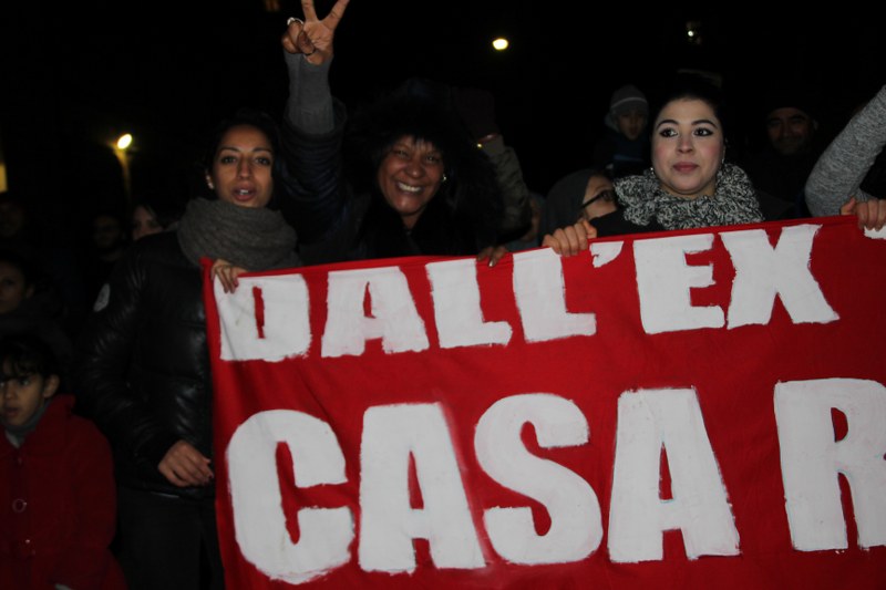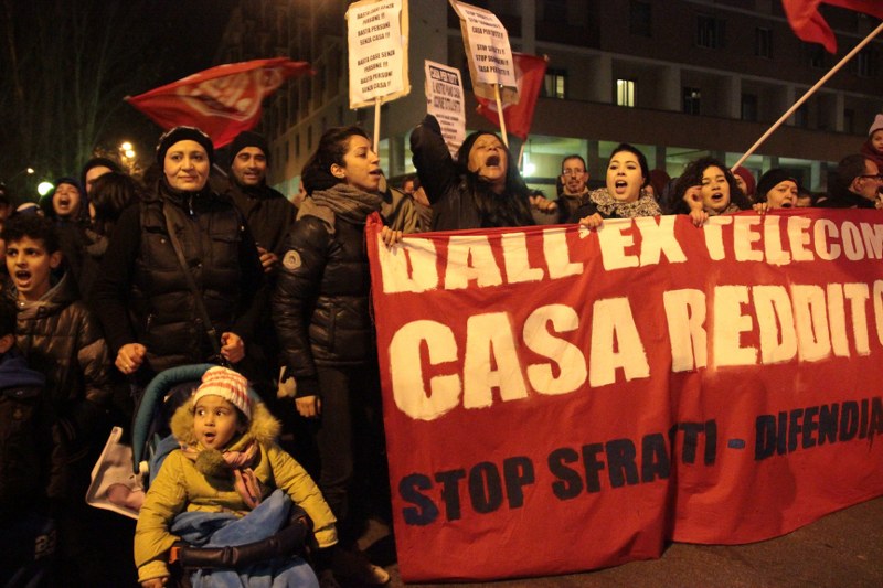 Lo slogan più ripeto è lo stesso da più di un anno: “Casa reddito dignità“. “Alcuni di noi avrebbero potuto salire sulla gru per disperazione, ma adesso ci siamo stancati di chiedere e vivere in miseria, la casa ce la siamo presa” dicono al microfono e poi ancora: “Uno stabile vuoto da dieci anni è uno schiaffo alla miseria, non ce lo possiamo permettere”. In corteo moltissimi bambini, con i passeggini in primi fila, ognuno con una bandiera “Stop Sfratti” o “Social Log”. Uno di loro si è vestito da Babbo Natale e distribuisce patatine. C’è anche chi ha fatto tutto il corteo con un cartone a forma di condominio sulla testa e guarda attraverso le finestre. Sul furgone c’è una casetta di cartone fatta dai ragazzi dell’Isart in occupazione.