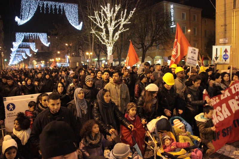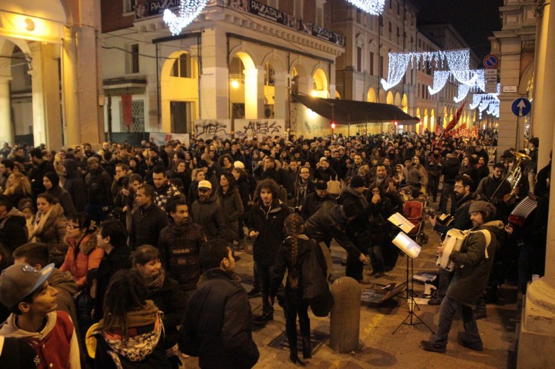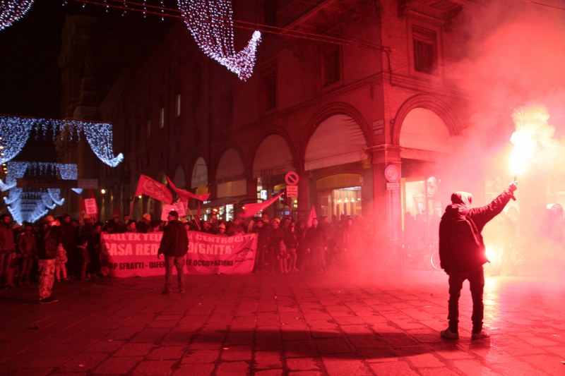 Quando il corteo arriva a metà di in via Indipendenza un’orchestra di strada inizia a suonare e per alcuni minuti il corteo diventa una festa. Poi l’arrivo in via Rizzoli e gli interventi di attivisti e occupanti si susseguono al microfono. Le storie si ripetono simili, storie di solitudine, di povertà improvvisa a causa di un licenziamento, la perdita della casa poi la decisione di occupare. “Grazie all’occupazione facciamo il Natale insieme e con un tetto sulla testa” dicono in conclusione del corteo, invitando i passanti delle ultime ore dello shopping delle feste a venire a conoscerli.