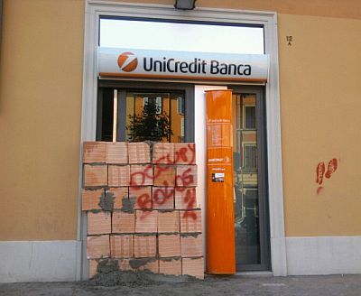 16 nov. – In una quarantina, con le maschere di Mario Monti sul viso hanno cercato di murare la filiale Unicredit di piazza Aldrovandi. Gli studenti che stanno occupando via Zamboni 38 sono arrivati davanti alla banca con lo striscione “Prima Tremonti poi Monti, ci smontano il futuro montiamo le lotte”, un secchio di cemento e alcuni mattoni.