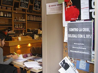 8 nov. – In attesa della manifestazione in programma domani nella zona universitaria, questa mattina gli indignados che si riconoscono nella sigla OccupyUnibo hanno distribuito volantini negli esercizi commerciali della zona. “Contro la crisi, solidali con il 99%!” c’era scritto sui manifesti affissi nelle vetrine di alcuni negozi. Come firma, i 3 hashtag di twitter simbolo della protesta contro “la dittatura del debito”: #occupyunibo #occupybologna #occupyeverywhere. “Anche qui a Bologna vogliamo creare delle assemblee permanenti” scrivono nel comunicato in cui ricordano la OccupyUnibo Parade in programma per venerdì prossimo, 11 novembre, in occasione della mobilitazione internazionale dell’11.11.11.