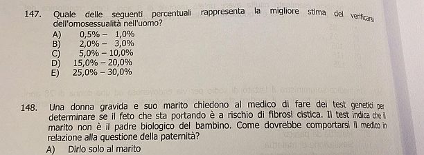 Bologna, 15 nov.- “Abbiamo avuto, in forma anonima, una delle domande del test Progress sottoposta oggi a 33.000 studenti di Medicina” e chiede “quale sia la stima del verificarsi dell’omosessualità nell’uomo”, nel “contesto di un test su diagnosi, genetica, malattie e comportamenti da tenere dinnanzi a certe malattie”. Lo scrive su Facebook Cathy La Torre, esponente di Sinistra Italiana, vice presidente del Movimento Italiano Transessuali e legale di molte cause a favore di transessuali. Il Progress Test 2017 è rivolto agli studenti in corso iscritti a Medicina e Chirurgia (dal secondo anno in poi), per valutarne i progressi nell’apprendimento. La Torre spiega di aver ricevuto il testo del quesito insieme a Marco Grimaldi, segretario piemontese di Sinistra Italiana: “Dunque – scrive su Fb – vogliamo sapere, e lo pretendiamo: se la comunità medica italiana, ritiene ancora che l’omosessualità sia una malattia. Vogliamo sapere: che senso ha chiedere a dei futuri medici la stima dell’omosessualità nell’uomo? Viene anche chiesta la stima della eterosessualità dell’uomo? Perché è bene ricordare che eterosessualità e omosessualità sono entrambe ‘varianti’ naturali del comportamento umano. Pretendiamo una risposta dalla Conferenza del Presidi delle facoltà di Medicina: perché questa domanda nel 2017? Non certo per rendere medici e scienziati persone migliori e con meno pregiudizi!”. “Indignarci e chiedere spiegazione – conclude – è una delle poche armi nelle nostre mani”.