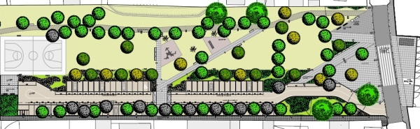 Nella documentazione fornita dal quartiere si trova una mappa simile, ma più particolareggiata. Gli alberi grigi verranno abbattuti, quelli in verde chiaro rimarranno, gli altri (verde scuro e giallo) saranno piantati. Le aree in grigio saranno quelle sottratte al verde.