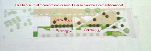 Il comitato nato contro la costruzione dei parcheggi nel Parco di Via Speranza ci ha inviato una cartina.”Quello che vedete nella slide – scrive il comitato – è come verrà trasformato il parco, le aree bianche saranno cementificate, e il parco giochi non avrà alberature. Gli alberi segnalati in verde scuro sono quelli che verranno piantati. Al momento tutta la zone è verde”.