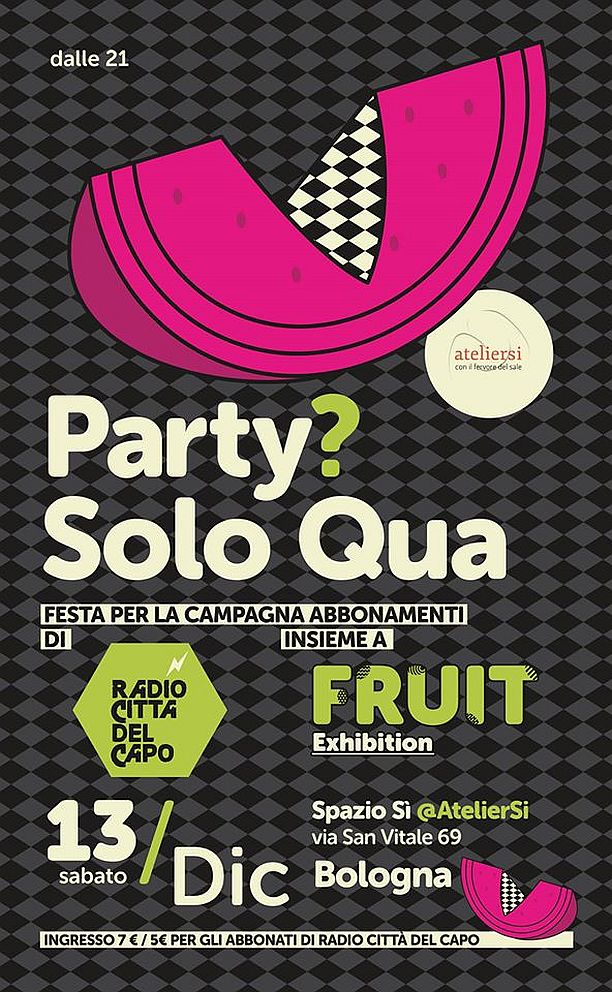 Segnatevi la data: sabato 13 dicembre all’Ateliersi di via San Vitale 67 arriva Party? Solo Qua! La festa della campagna abbonamenti di Radio Città del Capo! Assieme a Fruit Exhibition organizzeremo una festa a cui non potrete mancare! Si inizia alle 22 con il concerto de Le Ceneri e i Monomi e il loro alternative pop, e poi avanti fino a notte fonda con i dj di Radio Città del Capo che vi faranno scatenare sul dancefloor. In ordine di apparizione Francesco Locane, Jonathan Clancy, LaTotta e Lourdes, Laura Marongiu e Morra Mc.