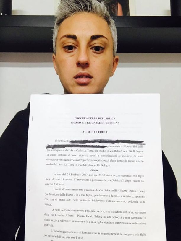 “Io sto andando in questo momento a sporgere denuncia per conto di Giovanni” spiega l’avvocata Cathy La Torre. “E’ un fatto di una violenza inaudita” dice l’avvocata che chiama in causa anche il Comune: “Chiediamo al Comune di Bologna di costituirsi parte civile nell’eventuale procedimento penale. Se infatti l’assessore Irene Priolo ci rammenta che gli automobilisti non sono tutti brutti e cattivi, quelli che si macchiano di reati gravissimi si meritano che la Città gli ricordi che Bologna non è questa roba qua! Perciò a Questura e Comune chiedo risposte concrete: per Giovanni, per sua figlia, per i 25 pedoni e ciclisti investiti e morti nel 2015 a Bologna”.