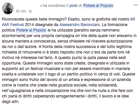 Rockit ha quindi pubblicato un comunicato sulle proprie pagine ufficiali del Festival, minacciando il ricorso a vie legali. Nei commenti al post, PoP risponde: “Ci spiace davvero tanto per i toni che leggiamo. A scanso di equivoci, chiariamo questa vicenda. Non abbiamo prodotto noi quest’immagine (e infatti non compare il logo ufficiale di Potere al Popolo!). L’immagine già modificata ci è stata inviata da diverse persone che la stavano utilizzando così come la vedete ora su social. Non sapevamo che fosse un lavoro di Alessandro Baronciani né tantomeno avevamo intenzione di sminuire o svalorizzare il suo lavoro né il vostro. Rispettiamo, come ci auguriamo saprete, prima di ogni altra cosa i lavoratori. Se la cosa arreca problemi vi preghiamo di contattarci tramite ufficio stampa o tramite la nostra pagina ufficiale per poter risolvere”.