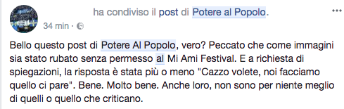Numerosi utenti web hanno protestato, accusando Potere al Popolo di non aver ottenuto il permesso né dall’artista pesarese né da Rockit, la testata musicale milanese che organizza da anni il festival indie.