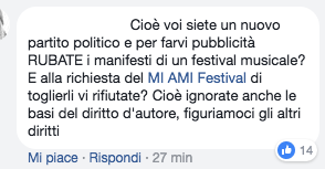 Un taglia e incolla via Photoshop che ha fatto arrabbiare molti, a cominciare dallo staff del festival. “Queste immagini – ha scritto il Mi Ami – sono state create, disegnate e utilizzate in supporto ad un festival musicale e non per essere marchiate in maniera coatta e unilaterale con il logo di un partito politico in cerca di voti. Queste immagini sono frutto del lavoro di un artista e espressione di un’azienda come la nostra che crede nella giustizia sociale, nella solidarietà, nell’uguaglianza e nella cooperazione ma che non ha nulla a che fare con chi parla di diritti ma calpesta arrogantemente i diritti, il lavoro e le idee degli altri”.