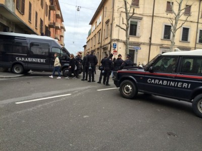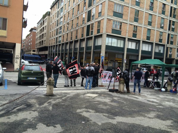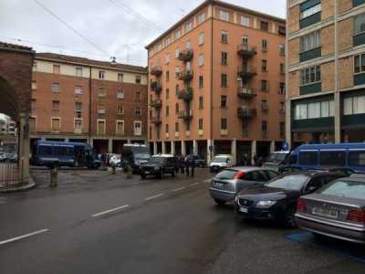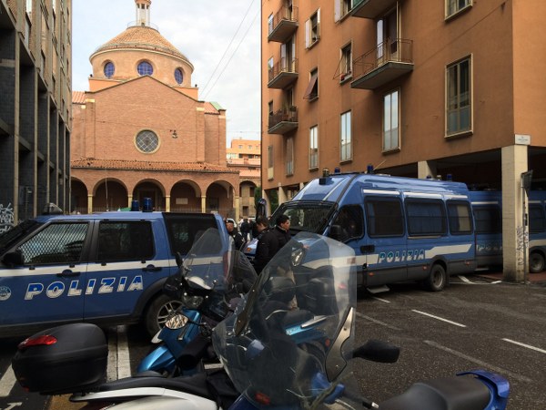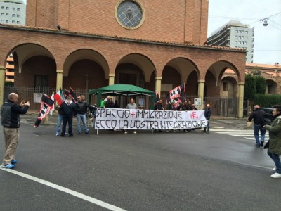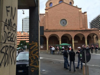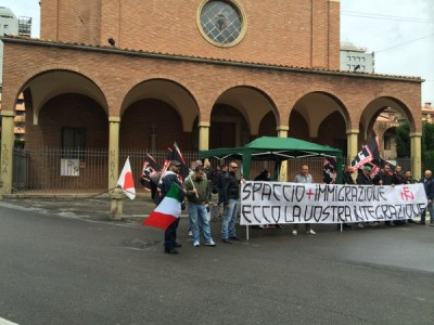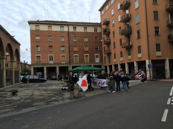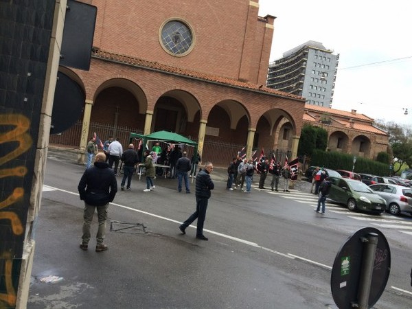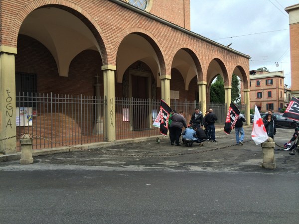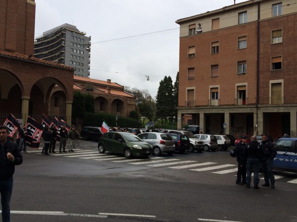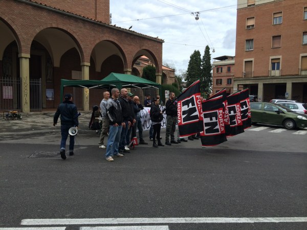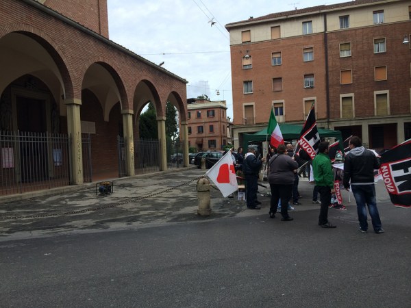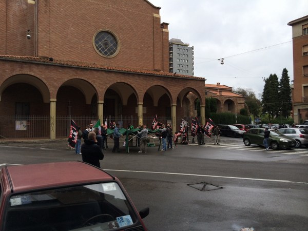 Intorno alle 15 poco più di una ventina di militanti forzanovisti ha iniziato a montare un gazebo verde. Un tavolino con sopra un piccolo mixer, un computer portatile, poco distante un generatore, delle casse stereo: da lì uscivano musica RAC (rock against communism) e i “successi” dei gruppi d’area. Da una smart nera parcheggiata nelle vicinanze, una ragazza con la cresta ha tirato fuori uno scatolone coi volantini. Grida in coro e al megafono “contro il degrado” della zona e di Bologna intera. “Diritto alla casa, diritto al lavoro, non ce l’abbiamo noi non ce l’avranno loro” uno degli slogan urlati dalla ventina di militanti, in larga parte maschi sulla trentina. Tutt’intorno la piazza che si apre di fronte alla chiesa era un deserto: ad impedire l’accesso (o a regolamentarlo strettamente) circa una cinquantina di agenti tra Polizia e Carabinieri: cinque camionette, una volante e due fuoristrada.