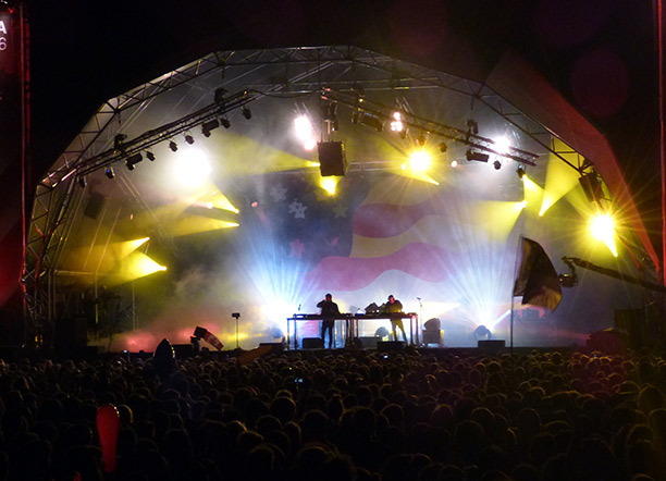 Il penultimo concerto della giornata è quello di una musicista che proprio i Radiohead hanno scelto come spalla per alcune delle date del tour mondiale di A Moon Shaped Pool, Holly Herndon che l’anno scorso ha dato alle stampe uno degli album di elettronica più interessante degli ultimi tempi, Platform. Sul palco la musicista è insieme a due colleghi, uno dei quali punteggia ogni tanto il live scrivendo frasi sullo schermo che fa da fondale al palco Pitchfork su cui il trio si esibisce. “Siamo dal vivo, quindi può essere che scazziamo qualcosa: ma voi siete con noi, vero?”, dice una delle prime scritte che leggiamo: nonostante la serietà del lavoro della Herndon, il clima è molto più vario, divertente ed eccitante di quello che si possa pensare a un semplice ascolto dei suoi lavori in studio. La musica che ci viene proposta fa un uso molto interessante delle voci, che si rincorrono in sorte di canoni spezzati, ben sostenute da massicce frequenze basse e ritmiche mai banali. L’ora di set scorre veloce e la Herndon si dimostra uno dei nomi da tenere d’occhio del nuovo panorama elettronico: davvero davvero brava.