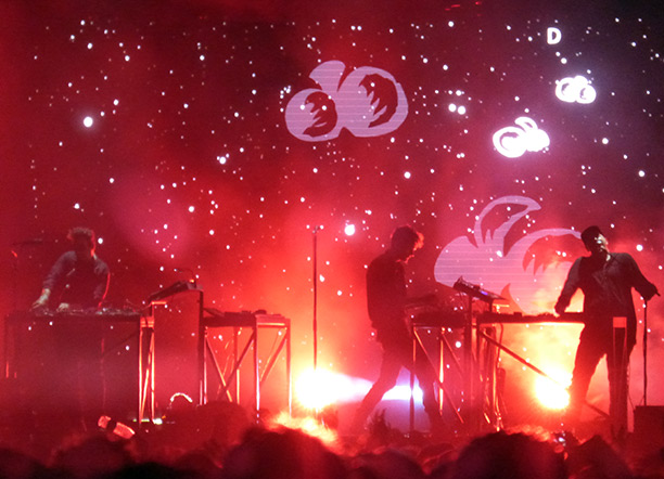Primavera Sound vuol dire anche e soprattutto varietà di generi: nelle orecchie ancora risuona la delicatezza del concerto precedente, quando le nostre viscere sono prese d’assalto dai bassi e dai beat dell’ultimo live a cui assistiamo, quello di Moderat. Il trio conferma da un lato di essere uno dei nomi della scena elettronica più di successo degli ultimi tempi e dall’altro di sapere giocare benissimo tra attitudine pop e mentalità da club. Certo, il club di ieri sera si estendeva per migliaia di metri quadri occupati da folle gioiose e danzanti, abbagliate da visual di grande impatto (ma forse si poteva fare di più): ciononostante la band tedesca è riuscita a coinvolgere tutti, suonando brani dai dischi firmati dalla congiunzione di Apparat e Modeselektor e offrendoci anche una cover di “Abandon Window” di Jon Hopkins, tra i protagonisti dell’edizione del Primavera di due anni fa.
