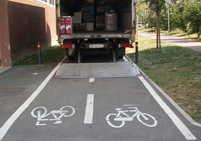 Nel luglio scorso scrivevano: “La ciclabile di Bologna che congiunge via Sebastiano Serlio con il Ponte della Dozza viene usata dal Centro Commerciale Minganti come zona di carico e scarico. I camion arrivano, tolgono il paletto della ciclabile, scaricano, rimettono il paeletto. In alcuni casi, ci segnala Mirko, viene usata anche come parcheggio nei tratti dove ci sono ancora le rotaie”.