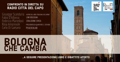 Due serate di dibattiti e dirette speciali organizzate da Radio Città del Capo: martedì 5 dicembre l’appuntamento è alle 18.30 al circolo arci RitmoLento (via San Carlo 12/A) per la presentazione di Bologna che cambia. Quattro studi etnografici su una città, il nuovo libro del professor Giuseppe Scandurra. A partire dalle riflessioni dell’autore, che esporrà i risultati di dieci anni di ricerche dedicate alle trasformazioni della città di Bologna, dalle 18.30 verrà dato spazio al dibattito in diretta al quale prenderanno parte: Fabio D’Alfonso (Link Bologna), Federico Martelloni (Coalizione Civica), Rosa Amorevole (Presidentessa del Quartiere Santo Stefano) e Carlo Di Gaetano (PeacockLAB). A moderare, il direttore Riccardo Tagliati.