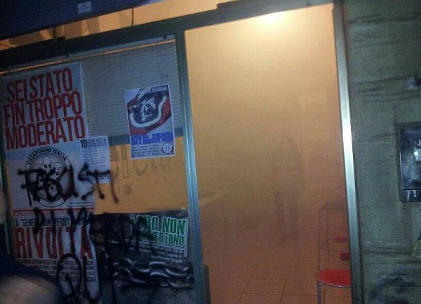 10 ott. – Un raid vandalico è stato compiuto verso le 19.30 di ieri nella sede bolognese di Casapound, in via Malvolta, zona S.Stefano. Alcune decine di persone, con il volto coperto, hanno tracciato scritte sulla vetrata (“Fascisti di merda”) e poi lanciato alcuni fumogeni dentro il locale, dove era in corso un incontro. A denunciare il blitz, con un comunicato apparso sulla pagina Facebook ufficiale di Casapound Bologna, sono gli stessi responsabili del movimento. “Una trentina di antagonisti hanno fatto irruzione nella sede di Sole e Acciaio dove stava per iniziare una manifestazione di solidarietà per il Kosovo organizzata dalle associazioni Sol.Id e CasaPound Italia. All’interno del locale era presente anche una ragazza al nono mese di gravidanza, poi accompagnata in ospedale per i necessari controlli, oltre ad altri quattro militanti di Cpi. Ad un certo punto – si legge ancora nella nota – abbiamo sentito da fuori un gruppo di antifascisti che lanciavano insulti e minacciavano di dare fuoco alla sede. Il tempo di affacciarci e dal gruppo è partito un fumogeno che è atterrato su alcuni fogli di carta che erano su una scrivania dando vita a un principio di incendio. Poi è partito un lancio di bottiglie. Siamo comunque riusciti a tirare giù la saracinesca, ma il gruppo da fuori l’ha forzata, riuscendo a infilare sotto la serranda un altro fumogeno che ha reso irrespirabile l’aria della sezione”.Dopo un primo sopralluogo fatto ieri sera, la Digos della Questura ha avviato le indagini.