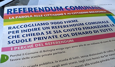 7 set. – Parte la raccolta firme per portare alle urne i bolognesi sul referendum consultivo sui fondi comunali alle scuole dell’infanzia private. La consultazione è promossa dal Comitato articolo33 che raccoglie anche realtà sindacali e associative e ha incassato l’adesione di Sel, Idv e dei Verdi. Servono 9mila firme entro tre mesi e i banchetti inizieranno sabato 8 settembre con i primi tavolini in centro storico e davanti alla festa dell’Unità. “Non c’è stato neanche il tempo di chiedere il permesso di fare i banchetti all’interno al segretario del Pd Donini – ha detto la portavoce del comitato articolo33 Francesca De Benedetti – perché ha detto subito che la nostra presenza non era gradita”. Ma il comitato è convinto che nell’elettorato di centro sinistra la consultazione sarà popolare.