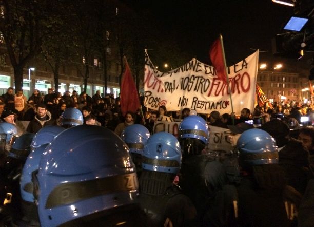 Erano circa duecento i contestatori che per qualche ora hanno aspettato Renzi all’esterno del PalaDozza. Divisi in due presidi: il primo era formato dai tirocinanti della giustizia; il secondo, più numeroso, era composto da militanti di collettivi e centri sociali e da attivisti dei sindacati di base. I primi avrebbero voluto raccontare a Renzi la propria difficile situazione; i secondi volevano contestarlo, come accaduto poche ore prima a Parma e come successo molte altre volte nelle scorse settimane. Fischietti, cartelli e grida da una parte; slogan, un impianto audio, striscioni, bandiere e fumogeni dall’altra. A presidiare il palazzetto dello sport decine e decine di agenti in tenuta antisommossa che sorvegliavano ogni accesso. Il presidio di collettivi e centri sociali si è avvicinato a pochi metri dal cordone di polizia e carabinieri: il fronteggiamento è durato alcuni minuti, sono volate alcune uova ripiene di vernice, e un paio di fumogeni, poi il presidio si è trasformato in corteo. All’esterno del Paladozza sono rimasti solo i precari della giustizia.