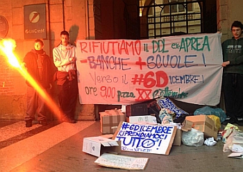 Per la città si sono fatti vedere anche altri studenti medi, quelli del collettivo Cas, che per lanciare la giornata di protesta del 6 dicembre hanno depositato sacchi della spazzatura davanti ad una sede Unicredit e all’ex provveditorato. Un gesto contro “il DDL ex-Aprea, vuole immettere privati e banche negli spazi decisionali della scuola”.