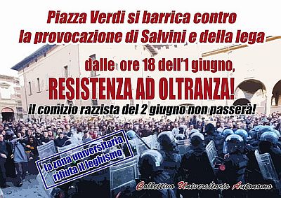 Dopo la decisione di Salvini di voler andare in Piazza Verdi, cuore della zona universitaria, non si fa attendere l’annuncio della contestazione. “Per il 2 giugno il leader della Lega Nord Matteo Salvini ha annunciato l’intenzione di tornare in zona universitaria per concludere la sua campagna elettorale – scrive il Cua, collettivo autonomo studentesco – provocando e minacciando di aggredire la Piazza degli studenti e delle studentesse di Bologna: Piazza Verdi. Gli studenti sono pronti a resistere al nuovo Almirante che propaganda odio razziale, intolleranza contro le differenze e xenofobia. Il 2 giugno Piazza Verdi si barrica!”