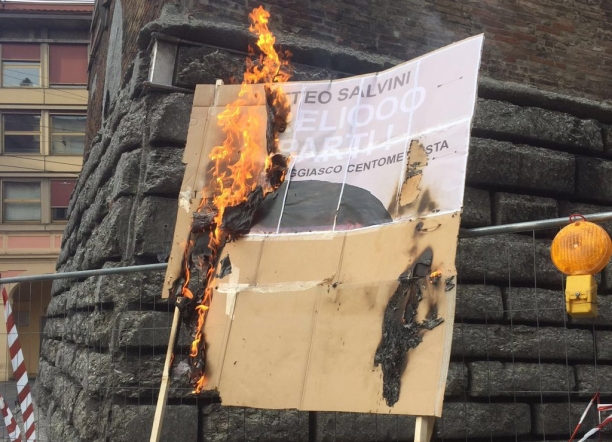 Oggi pomeriggio la zona intorno al ritrovo leghista era blindata dalla polizia e il traffico deviato, bus compresi. Poco lontano, in piazza di porta Ravegnana, una decina di attivisti del collettivo Hobo ha dato fuoco a una gigantografia del libro di Salvini. Qualche settimana fa, in occasione della precedente venuta di Salvini in città, Hobo aveva strappato le pagine di quella pubblicazione all’interno di una libreria del centro.