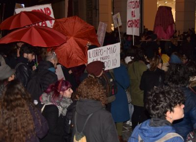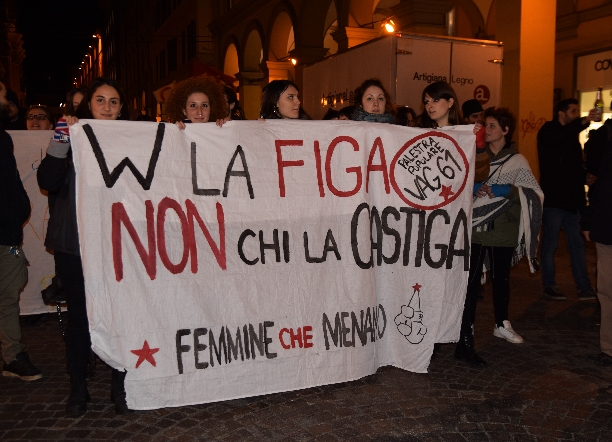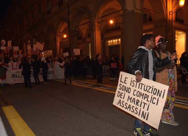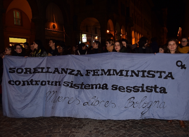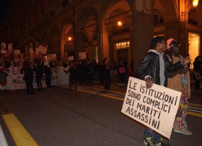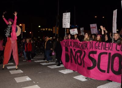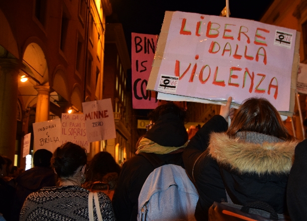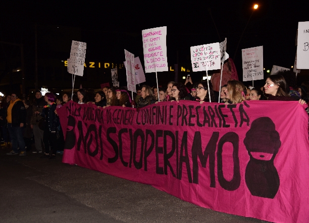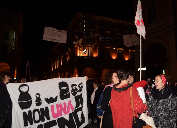 8 mar. – Un ampio lenzuolo nero e fuxia, “Noi scioperiamo”, ha guidato le migliaia di donne e uomini scesi in piazza per manifestare contro la violenza maschile e di genere al termine della giornata di mobilitazione promossa dalla rete Non una di meno. Partito da Piazza Nettuno intorno alle 18.45, il corteo ha attraversato il centro città, lungo via Indipendenza e via Matteotti, fino a raggiungere la destinazione fissata in Piazza dell’Unità.