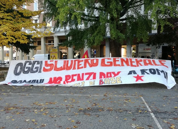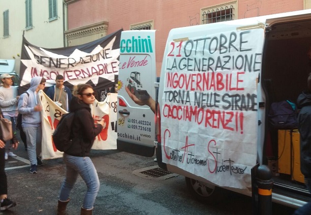 Bologna, 21 ott. – Lavoratori, studenti dei licei e dell’Università di Bologna sono scesi per le vie della città in pochi, 150 persone in tutto. Hanno manifestato in occasione dello sciopero generale indetto dai sindacati autonomi Usb, Usi e Unicobas per protestare contro le riforme del governo Renzi e per il “no sociale” alla riforma costituzionale. Lo sciopero ha coinvolto i lavoratori della Pubblica Amministrazione, enti pensionistici, università, scuola, enti locali, sanità e trasporti ferroviari.