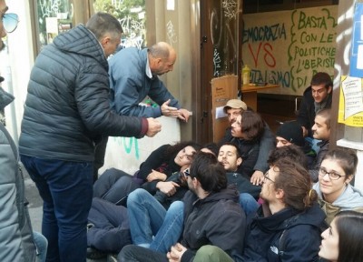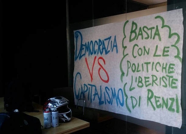 Mentre in città si muovevano i cortei, una trentina di studenti di Lubo, il collettivo nato all’interno di Labàs e Tpo, ha occupato uno stabile in via Zanolini, 19 dove si trovava la sede, ormai dismessa da anni, di Banca Etruria. “Abbiamo deciso di praticare lo sciopero occupando una ex-banca di proprietà di Banca Etruria per toglierla alla speculazione e all’alienazione bancaria e ridarla per la prima volta alle persone che dalle banche sono sfruttate e ricattate” ha detto Ilaria Riccardi, attivista di Lubo. Dopo poche ore è intervenuta la polizia, portando via a forza i ragazzi seduti per terra davanti all’ingresso.
