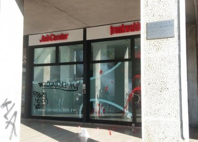 Gli studenti medi del Cas, il collettivo autonomo studentesco, invece, si sono ritrovati in una quarantina questa mattina in piazza XX Settembre e hanno raggiunto gli studenti del Cua, il collettivo autonomo universitario, in piazza Verdi per l’iniziativa da loro indetta in occasione dello sciopero. Da qui è partito un corteo di poco meno di un centinaio di persone che si è fermato in viale Masini lanciando della vernice rossa sulle vetrine della sede bolognese di Trenkwalder, l’agenzia interinale che è in ritardo nel pagamento dello stipendio ai lavoratori impiegati nelle aziende con i quali ha firmato i contratti di somministrazione e che il 19 ottobre, senza alcun preavviso, ha chiuso molte filiali. Il giorno successivo l’agenzia ha riaperto le porte ma solo per dare informazioni ai dipendenti che chiedevano notizie del loro stipendio. “Queste sono le conseguenze delle politiche che ormai da vent’anni stanno devastando il mondo del lavoro e che, con il Jobs Act del governo Renzi, hanno reso la situazione non più sostenibile”, hanno scandito i manifestanti al megafono.
