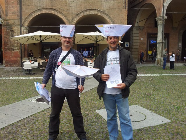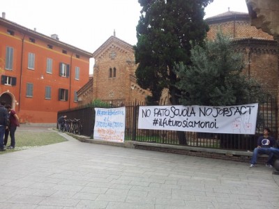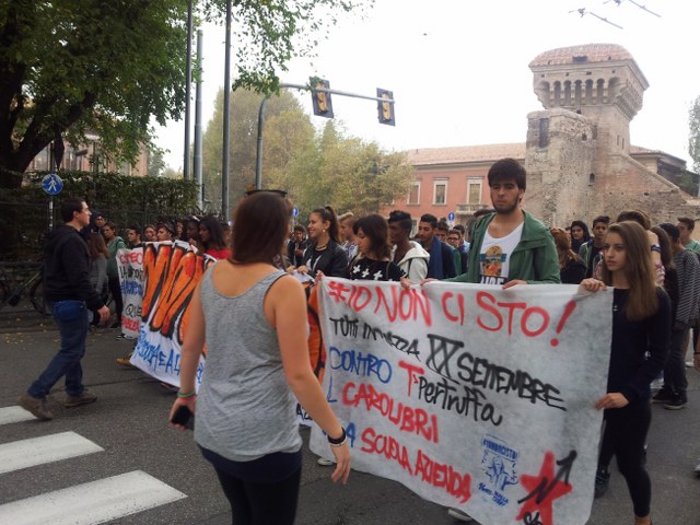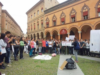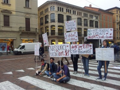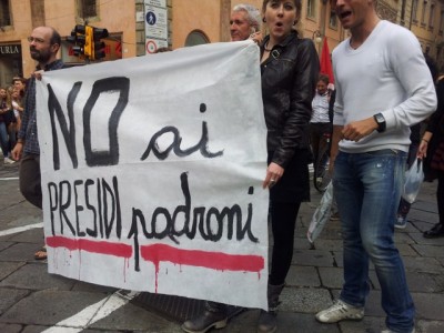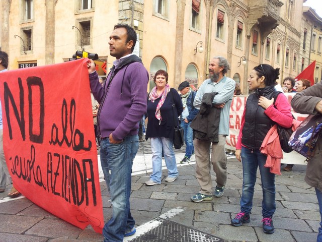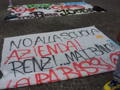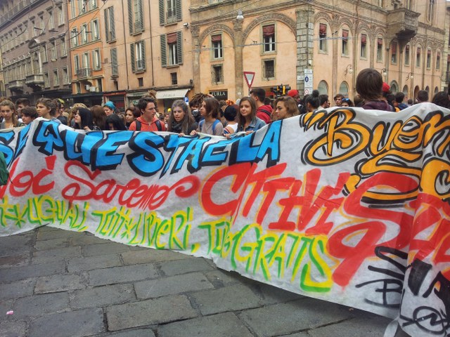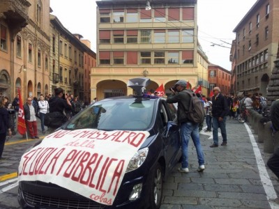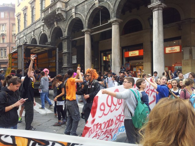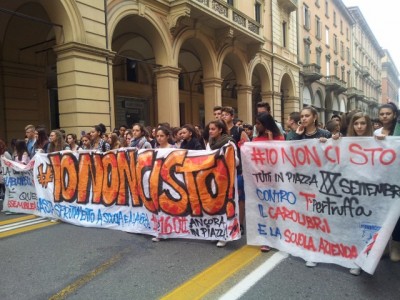 Bologna, 10 ott. – Quattro cortei hanno attraversato il centro di Bologna questa mattina a partire dalle 9, nella giornata di protesta del mondo della scuola contro il governo Renzi che in città ha portato in piazza più di 500 persone. Oltre a quello dei lavoratori dei Cobas scuola, partiti dopo un presidio davanti all’ufficio scolastico provinciale di via de’ Castagnoli, c’è stato un corteo degli Studenti medi autorganizzati che da piazza S. Francesco si sono ritrovati proprio con i Cobas in piazza S. Stefano per un’assemblea comune. Sempre in piazza S. Stefano, poco prima, erano arrivati i ragazzi della Rete degli studenti medi e della Rete degli universitari, che prima delle 9 avevano inscenato un sit-in con cartelli in via Rizzoli.
