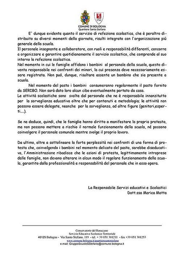 Il sindacato Cobas, che supporta lo sciopero, ha intanto attaccato il quartiere Santo Stefano che, in una nota, ha counicato che “Nel momento del pasto i bambini consumeranno regolarmente il pasto fornito da Seribo. Non sarà dato loro alcun cibo eventualmente portato da casa“. Il quartiere spiega la nota con vincoli di regolamento e necessità didattiche. I Cobas invece lo considerano una sorta di boicottaggio legato a “interessi di bottega”.