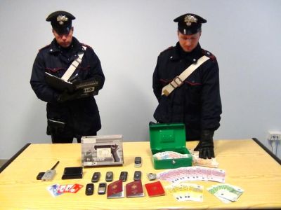 Nella foto, i militari mostrano il materiale sequestrato durante il blitz nel covo ravennate degli sfruttatori. Contanti per 13mila euro, diversi cellulari e un apparecchio per rilevare microspie.