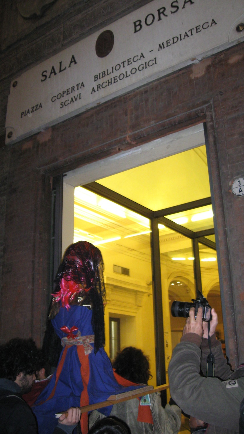 Nel pomeriggio un corteo di un centinaio di persone si è riunito in Piazza Verdi per poi raggiungere l’auditorium di Sala Borsa dove dalle 18 si è tenuta un’assemblea. La manifestazione ha bloccato il traffico sotto le Due Torri dietro lo striscione “Community Center Santa Insolvenza una piazza coperta per tutti”. Dal megafono slogan contro il sindaco: “Dopo lo sceriffo Cofferati abbiamo il sergente Merola”.