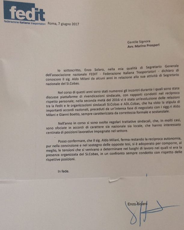 Prosperi, a sostegno dell’innocenza di Milani ha mostrato anche una lettera firmata da Enzo Solaro della Fedit, la federazione italiana trasportatori. In pratica la controparte dei Si Cobas in molte trattative. Solaro, che con la Fedit ha firmato accordi con i Si Cobas, nella lettera racconta della correttezza “formale e sostanziale” di Milani nelle trattative.